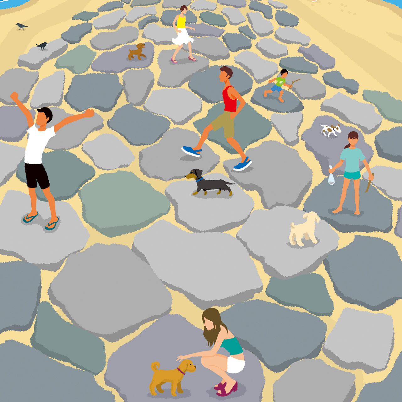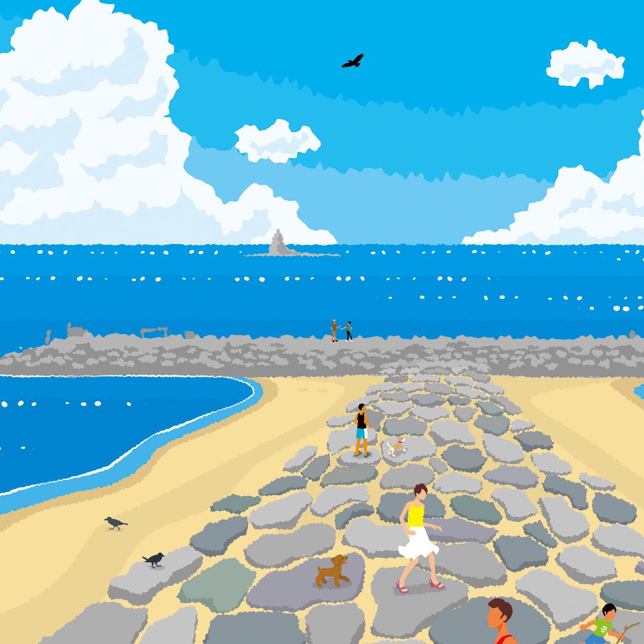 いつも人で賑わう茅ケ崎の名所。茅ヶ崎海岸を浸食から防ぐために作られたT字型の突堤です。巨大な岩が積み上げられていて、よく見ると石の色も意外とカラフルで楽しくもあります。