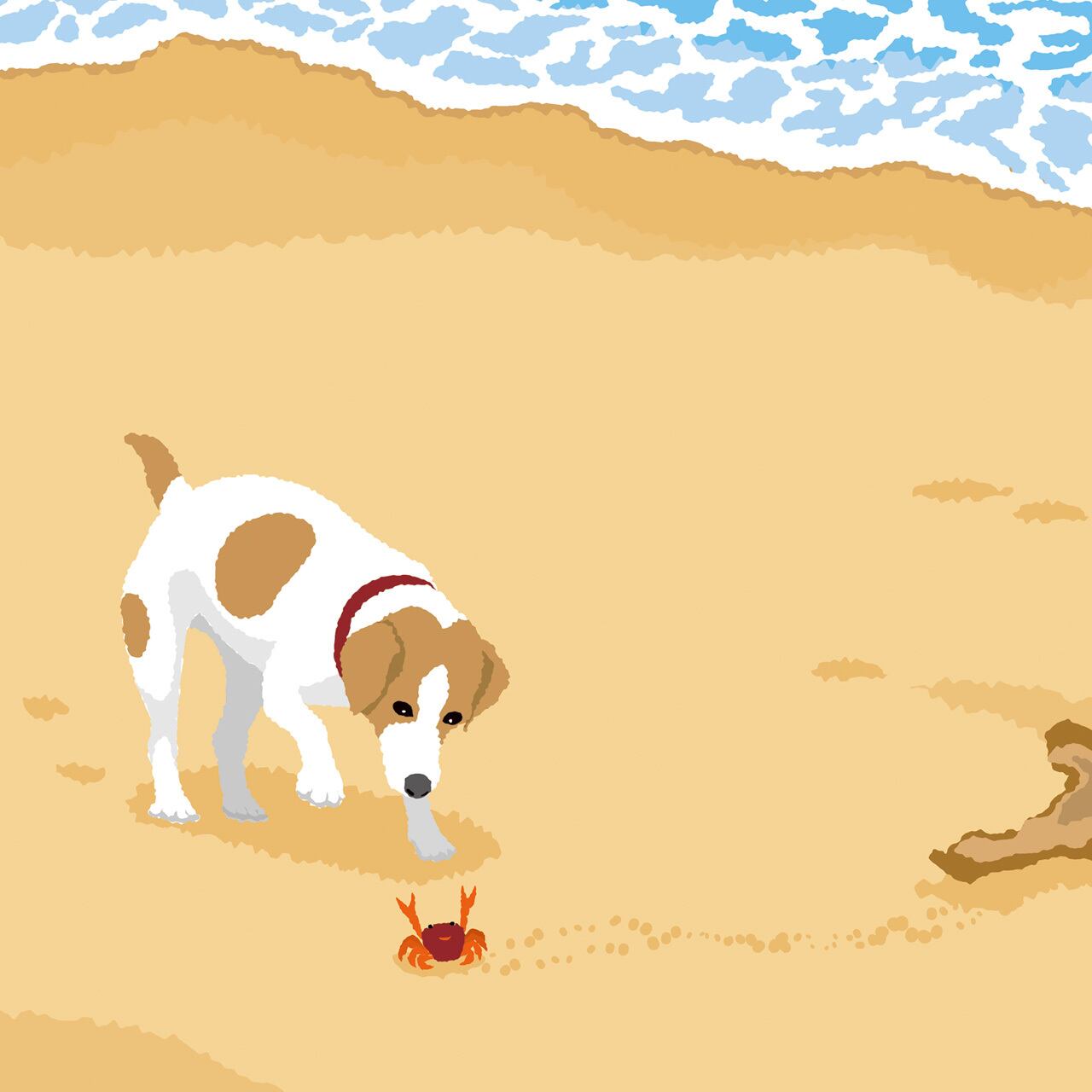渚で流木のかげから出てきたカニとジャック・ラッセル・テリアの遭遇を描きました。カニは驚いて威嚇しています。