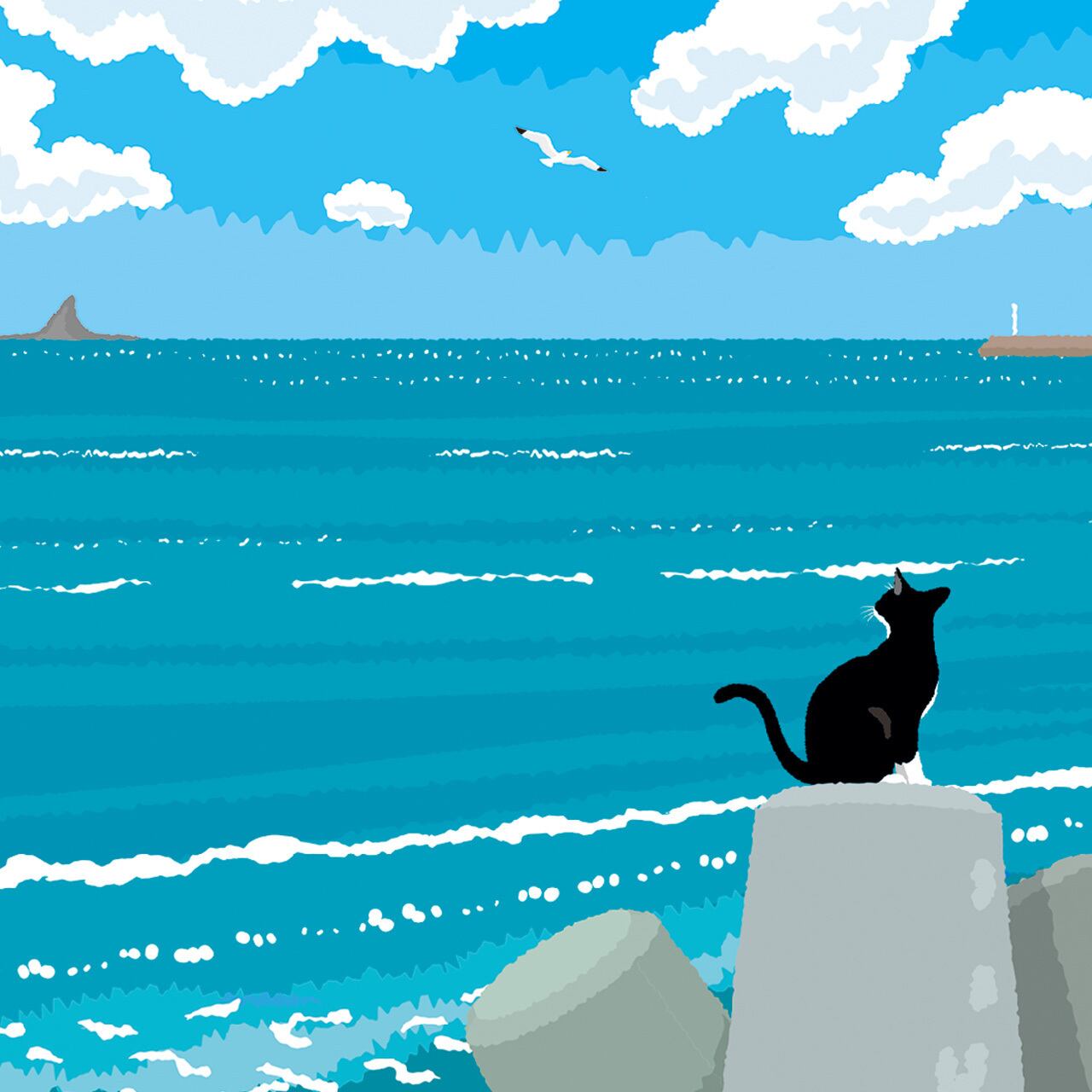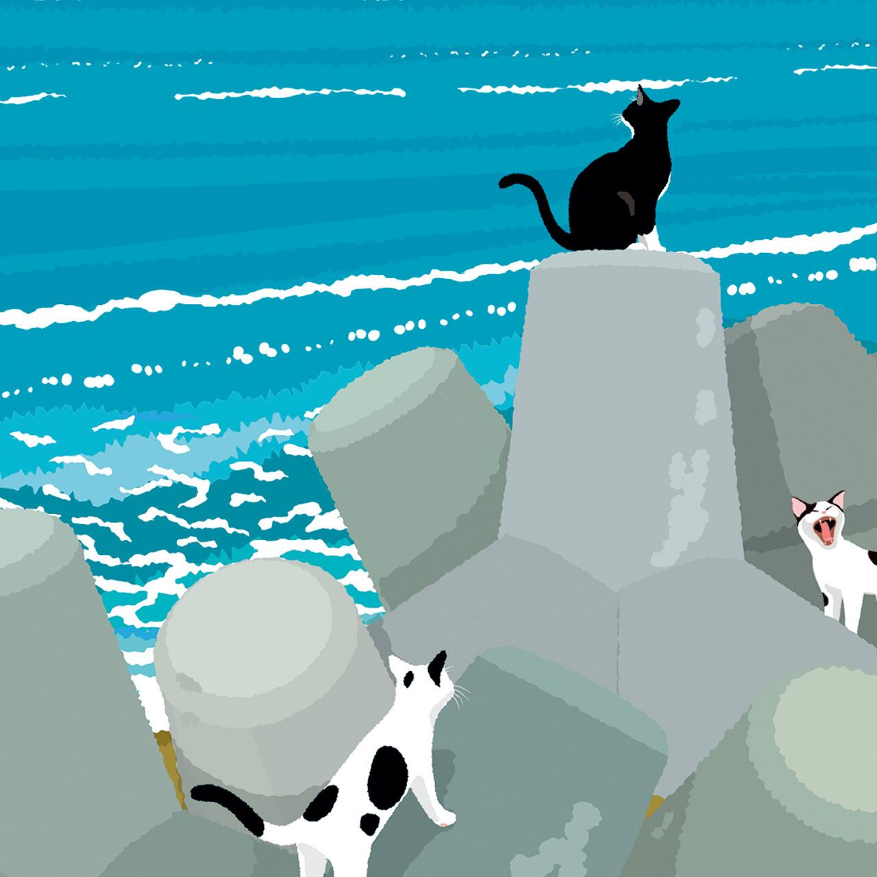 天気の良い午後、どこからともなく集まってきた猫達の姿を描きました。 テトラポットは猫達には絶好の遊び場です。